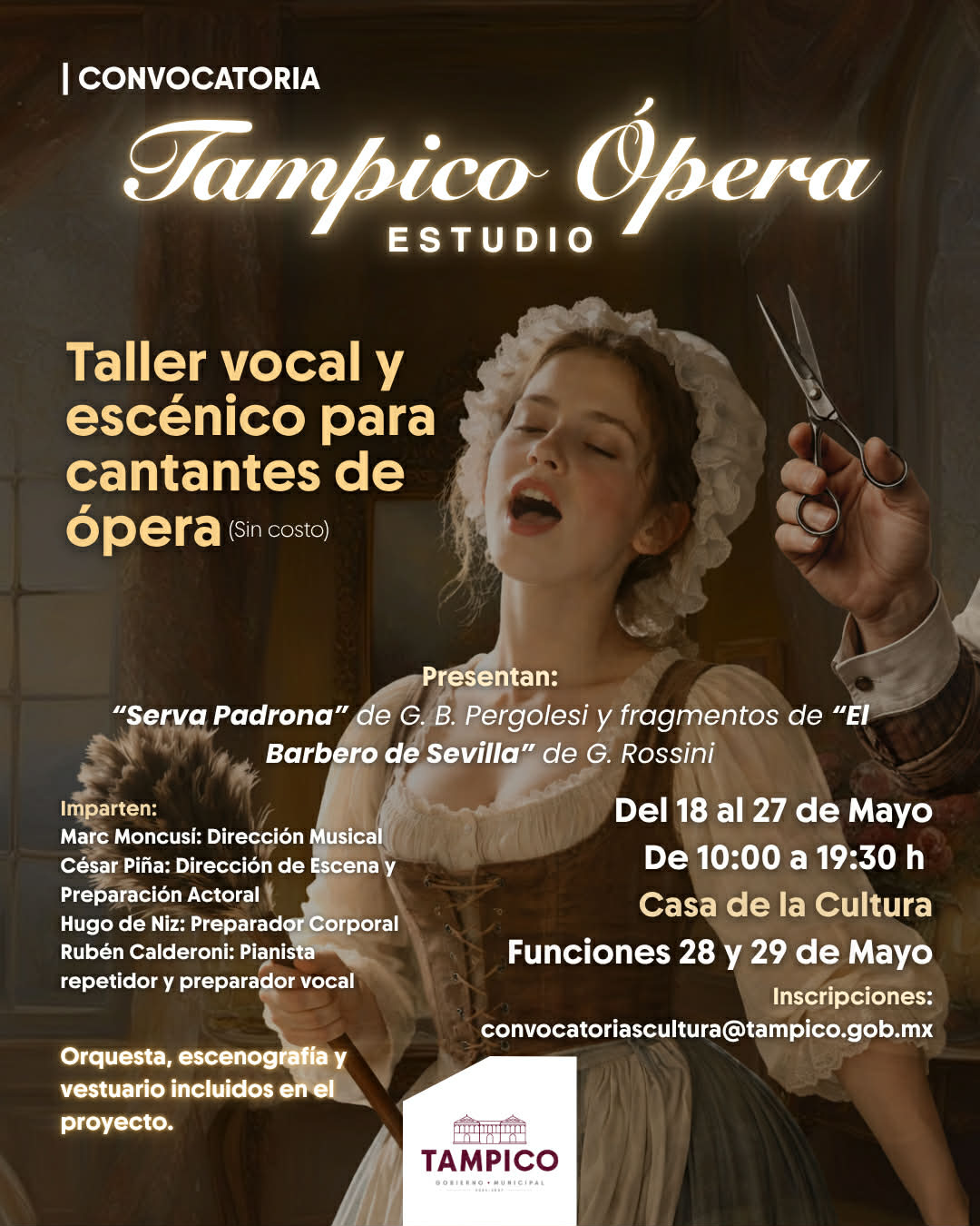 Tampico Ópera Estudio 18/05/2026 Casa de la Cultura (Tampico, México) . G.B.Pergolesi: La Serva Padrona . G. Rossini: Il Barbiere di Seviglia Stage director & choreography | César Piña